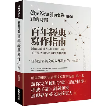 《紐約時報百年經典寫作指南》是《紐約時報》資深編輯們以表現成熟文雅的寫作要素為目標,精心彙整而成的寫作字彙使用手冊,可幫助所有職業筆者編輯寫出語法精準、符號正確與風格洗鍊文章,榮獲亞馬遜英文寫作技巧與英文編輯參考書4顆半星評價: