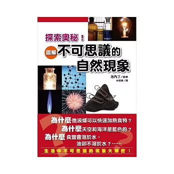 解說詳盡的文字內容,搭配將精要易懂的插畫,讓您隨著本書一起探索身邊許多不可思議的自然現象!本書將出現在身邊的顏色、聲音、空氣、溫度、金屬、電氣等「不可思議」現象,用簡單易懂的文字和插圖加以解答,讓讀者都能將每一種不可思議的自然現象原理加以充分理解並吸收成為常識。這是一本從小孩到大人都適合閱讀的好讀物,也希望讀者都能藉由此書更加瞭解這個奧妙的世界。