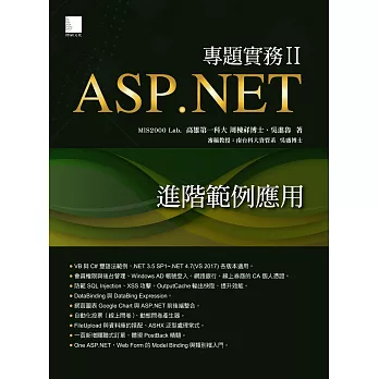 編寫本書的主要目的是要給已經學會ASP.NET基礎技能,而想要持續精進、提升能力的專業工程師,是一本具備實戰經驗的進階範例集,全書涵蓋重點如下: ★最詳細的「會員控管」範例,自己動手親自撰寫程式(Session),由淺入深,一應俱全。 ★會員權限控管,從入門的「障眼法」到「PlaceHolder動態加入控制項」。 ★GridView、ListView、DetailsView與FormView四大天王控制項,自己動手寫各種功能。 ★防範資料隱碼(SQL Injection)與XSS(跨網站腳本)攻擊。 ★透過Windows AD登入與網路銀行同級的「CA個人憑證」登入。 ★簡單完成多國語系的網站。MasterPage主版頁面的動態切換。 ★LinqDataSource、ObjectDataSource(商業物件)控制項的深入解說,搭配Class類別檔。 ★自己動手寫首頁、網站增修功能。不需大型控制項,磨練ADO.NET功力。 ★強調網站的Master-Detail(主表明細)涵蓋電子商務、知識管理、媒體網站各種需求。 ★CKEditor超強大的線上HTML輸入畫面。NPOI讓您讀取與輸出Excel檔。 ★網路問卷、線上投票、網路長條圖的應用。ASP.NET Chart(圖表)控制項入門。 ★不可思議的網頁圖表Google Chart + JavaScript與ASP.NET整合。 ★「全自動化投票」範例即裝即用。「動態問卷產生器」可自行搭配題型(單、複選、文字輸入)。 ★北風貿易系統、線上飲料訂購系統,一個畫面完成關聯式訂單、購物車。 ★OutputCache網頁輸出快取,輕而易舉提升網頁效能。 ★One ASP.NET,Web Form的Model Binding。? ???zh_TW.webpac.bookDescSource???:博客來網路書店