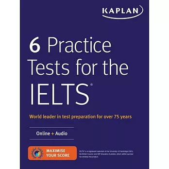 Kaplan's 6 Practice Tests for the IELTS provides printed exams and expert explanations for all four sections of the IELTS Academic test. Realistic practice questions, personalised performance reports, and test-like Listening tracks help you face the exam with confidence.The Most PracticeSix full-length practice exams for the IELTS Academic testPractice questions with detailed answer explanations help you build your Listening, Reading, Speaking, and Writing skillsListening tracks for test-like practice on CD and onlineOnline study plan with personalised score reports to identify your strengths and weaknesses so you can customise your studyExpert GuidanceKaplan's expert psychometricians ensure our practice questions and study materials are true to the test.We invented test prep--Kaplan (www.kaptest.com) has been helping students for almost 80 years. Our proven strategies have helped legions of students achieve their dreams.Each year, hundreds of thousands of people in over 140 countries worldwide take the IELTS exam in order to demonstrate English-language proficiency. The exam, which tests listening, reading, writing, and speaking skills, is used for entrance into universities, nonacademic business settings, and as a part of immigration applications for permanent residence or citizenship in several English-speaking countries. The IELTS is an approved English-language test for U.S. and UK naturalization and visa applications.