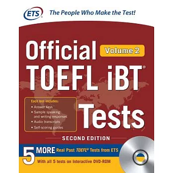 The bestselling collection of MORE Official TOEFL iBT(R) Tests from ETS, the maker of the test Are you preparing to take the TOEFL test? Official TOEFL Tests, Volume 2 gives you all the tools you need to achieve your best score. This book from ETS contains five more retired TOEFL(R) test forms with authentic reading, listening, speaking, and writing questions, plus an answer key for each form. This third edition reflects the all the latest changes and updates to the test. You also get a DVD containing all five interactive tests as well as a downloadable audio file with all the passages and sample responses in the listening and speaking sections. You will learn how to construct a proper answer and how to integrate your speaking, listening, and writing skills to demonstrate English proficiency.The book features: - 5 full-length sample TOEFL tests, available both in the book and on DVD- Real TOEFL essay-writing prompts- Sample responses for the speaking and writing test sections- Downloadable audio for all the listening and speaking sections- Answer keys, self-scoring guides, and more