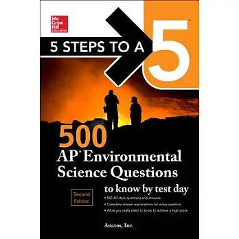 500 Ways to achieve your highest scoreFrom Atmospheric Conditions and Soil Dynamics to Pollution Types, Alternative and Renewable Energies, and Global Change and Economics, there is a lot of subject matter to know if you want to succeed on your AP Environmental Science exam. That's why we've selected these 500 AP-style questions and answers that cover all topics found on this exam. The targeted questions will prepare you for what you'll see on test day, help you study more effectively, and use your review time wisely to achieve your best score.Each question includes a concise, easy-to-follow explanation in the answer key. You can use these questions to supplement your overall AP Environmental Science preparation or run them shortly before the test. Either way, 5 Steps to a 5: 500 Environmental Science Questions will get you closer to achieving the score you want on test day.