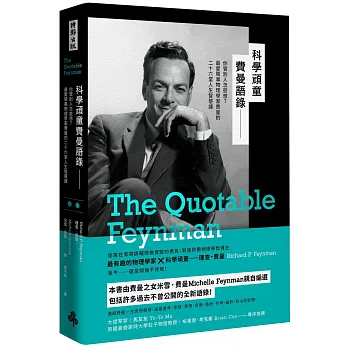 (理查.費曼)把科學天才和普通人的語言結合在一起⋯⋯現在,在他榮獲諾貝爾獎三年後出生的女兒米雪.費曼,為他從大量的著作、演講稿、文章和科學論文中編選出這本精華語錄。————《華盛頓郵報》(Washington Post)