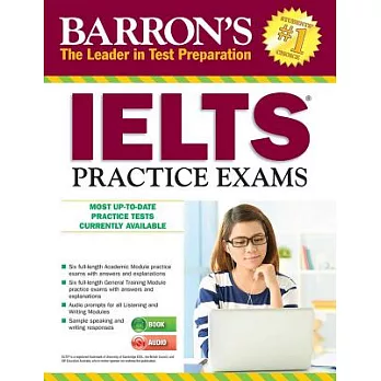 Publisher's Note: Products purchased from Third Party sellers are not guaranteed by the publisher for quality, authenticity, or access to any online entitlements included with the product. This newly updated second edition with MP3 CD prepares test takers for success on the IELTS, an English competency test that's recognized by more than 9,000 organizations in over 145 countries. The program presents: Six full-length Academic Module IELTS practice exams with answers and explanationsSix full-length General Training Module IELTS practice exams with answers and explanationsAudio prompts for all of the tests' listening modulesSample responses for the writing and speaking modulesESL students can increase their language fluency by using this book and MP 3 CD package alone, or they can use it along with Barron's IELTS, Essential Words for the IELTS, and IELTS Strategies and Tips, all of which contain extensive practice and review for all of the IELTS test sections.