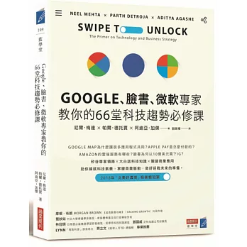 由Google、微軟、臉書三產品經理合撰,由基礎談起,以內行人角度解說你不能不知道的①科技問題和②背後的商業策略概念。不掉書袋,以說明、比喻、圖解方式介紹,平易近人,好讀好吸收。