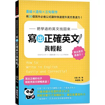 本書從「進行英文寫作」的觀點出發,以國中程度的英文文法為基礎,挑選 20 個進行英文寫作時一定要會的必備公式,讓你能透過套用句型來培養寫作所需的句子架構能力,書中詳細分析中文和英文在表達時的句型差異,並藉著「重組」及「造句」的練習,讓你熟悉寫作公式,逐步累積寫作所需的基礎能力。