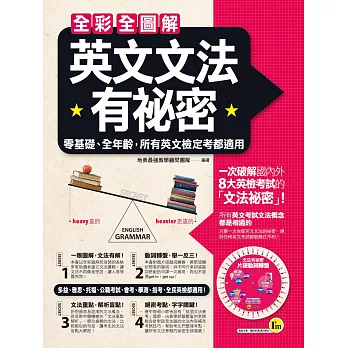 文法就是語言的規則,自然不管哪個英文考試文法概念都是相通的,那麼只要用《全彩全圖解英文文法有祕密》一次破解英文文法的祕密,遇到任何英文考試都能無往不利!不論多益、雅思、托福、公職考試、會考、學測、指考、全民英檢等國內外英檢考試都適用!