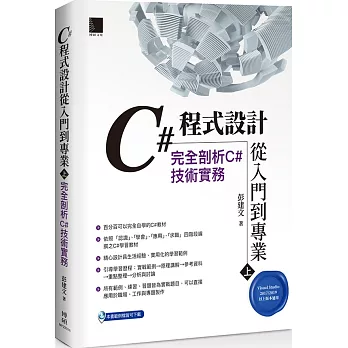 作者將C#程式設計的實務知識分為「基礎篇」、「進階篇」、「深入篇」等三個層級,本書內容精心規劃了十個章節及五個附錄,主要教導Windows Form應用程式、判斷與選擇、重複敘述、變數範圍、常用類別、陣列、常用控制項等基礎概念,以及自訂函式、列舉與結構、檔案處理等進階概念。除了可讓初學者快速入門C#程式設計,再搭配本書的精選範例以及清楚詳盡的步驟說明,將可逐步讓你邁向C#程式設計專業之路。