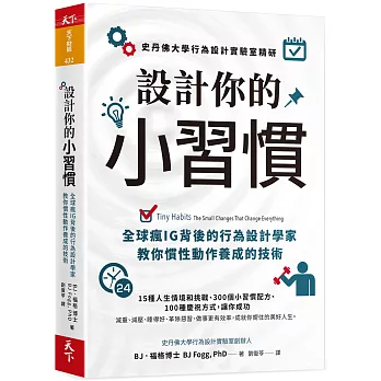 福格博士指導你使用這本書的技巧,幫助改變你的人生——並顛覆我們對人類行為的觀念。你將從一篇篇突破性的發現,學到改變自己最簡單有效的方法。他會告訴你如何對你的成功感覺美好、而不要在你的失敗上鑽牛角尖。無論你想完成什麼,《設計你的小習慣》都能助推你輕易達成。