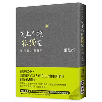 作者簡介張曼娟自從2000年開始,張曼娟與麥田出版社合作,推出【張曼娟藏詩卷】系列,開創了古典新詮的寫作潮流,更完成了全齡閱讀的新境界。青少年在閱讀中提升了審美觀;成年人在閱讀中感受到被同理,堪稱為「文普創作」第一人。2021年來到後疫情時代,張曼娟體驗並思索孤獨的意義。十位詩人,十段人生故事,在獨行中依然有堅持的勇氣,像星星那樣璀燦光亮。相關著作:《天上有顆孤獨星:照亮世人獨行時(限量親筆簽名/東坡名句藏書章)》《人間好時節(流金歲月版)》《愛情, 詩流域(紀念珍藏版)》《當我提筆寫下你--你就來到我面前》《當我提筆寫下你--你就來到我面前(張曼娟手寫概念書特別套裝版)》《好潮的夢--快意慢活《幽夢影》》《柔軟的神殿》
