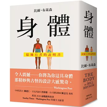 扛鼎之作……布萊森在從原子空間橫跨星際宇宙,寫下這個地球與天外世界的物理性質之後,如今所推出的新書,則將目標轉向人體內部,詳細解釋了我們的人身組成,同樣出之以明朗清晰、幽默風趣的風格……成果讓人嘆服……他援引了許多專家的說法,以及來自好幾百本書的資料,帶領讀者從頭到腳,從體外到體內,從不可思議的高效人體運作,到系統出錯引發的惡性混亂,一一探究人體的萬般奧秘……你將對你的整套人身設計,如此精密非凡卻又充滿諸多古怪之處,報以連連驚嘆。──《華盛頓郵報》(The Washington Post)