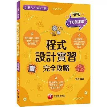本書根據108課綱十二年國民基本教育技術型高級中等學校電機與電子群課程綱要所摘要「程式設計實習」的學習重點而全新編寫,將相關程式元素的定義及用法清楚說明,包含基本觀念中的資料型態(Data types)、常數(Constants)、變數(Variables)、程式的組成(運算元、運算子)、控制結構(Control structures)、迴圈結構(Loop structures)、陣列與結構(Arrays and structures)、函式(Functions)、基礎資料結構(Basic data structures);包含佇列(Queues)和堆疊(Stacks),以及物件導向結構(Object Oriented Structure) 。