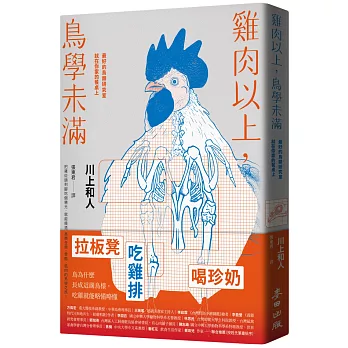 《雞肉以上,鳥學未滿:最好的鳥類研究室就在你家的餐桌上》是日本極受歡迎的鳥類學家川上和人以他在《科學》雜誌的連載專欄「鳥學廚房」改寫而成,主旨乃是從生活中常見的雞和雞肉來認識鳥類。全書共分六大部分,前言介紹了鳥類在人類歷史中的出現,從家雞的馴化帶入「從吃雞來認識鳥類」的主題。接下來的四章則按照「雞胸和雞翅」、「雞腿和雞腳」、「骨骼和內臟」、「雞屁股、雞皮與頭部」等順序來介紹,最後以「雞蛋和鳥蛋」作結。每一章節內容都以雞肉食用部位還有大家最在意的「口感」來切入,再按段落主題連結到鳥類構造、生理特徵,甚至演化的歷史,並比較家雞和現生鳥類與哺乳動物的不同,此外,也穿插著特殊鳥類的介紹,以及它們在日本常民文化中所占的有趣地位。作者講解生動清晰,雖是專業鳥類學,卻充滿各種宅學冷知識,是一本專業基礎強大、風格卻又迥異於市面一般科普書籍的鳥類學專書!