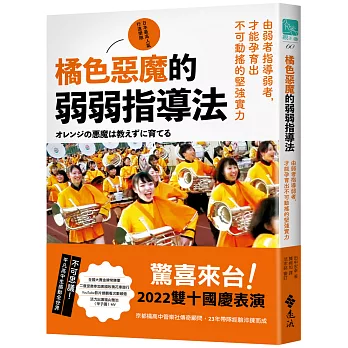 作者以樸實的日常故事,讓讀者得以瞭解京都橘不同於「橘色惡魔」的樣貌。他提出的「不教導的指導法」或是「弱弱指導法」,皆是強調學生溝通、解決問題的能力及自主性,這是求學階段在社團才能學習到的核心能力,也與我這幾年的教學經驗不謀而合。讀完本書覺得意猶未盡,無論你是行進樂隊的一員,還是對這支傳奇隊伍有興趣的朋友,我都十分推薦這本書!── 賴聖沂 北一女中樂隊行進教練