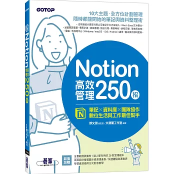 由Notion最實用最基本的操作開始,一步驟一圖文全面詳解,不論是個人或團隊應用,輕鬆編排文字、圖片、音樂、影片、附件...等,以及資料庫到報告產出,跨平台應用,全方位高效掌握。