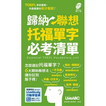 本書收錄托福測驗(TOEFL) 的高頻率字彙,並將內容依照歸納聯想方式分為六大單元:相似詞、相關詞、延伸、一字多義、單字聯想、單字家族。讀者可以按照直覺聯想,在短時間內輕鬆學習3~5個相關字彙。本書同步提供MP3音檔線上下載並具備點讀功能,讀者透過聆聽英語朗讀,不但能有效提升字彙能力,也可以熟悉字彙正確發音。