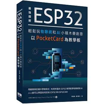最強圖解 ESP32輕鬆玩物聯網和AI小積木疊創意 以PocketCard為教學板 用最簡單的積木學寫程式,利用特製的ESP32教學板學物聯網與AI,人人都可以學習如何控制ESP32與ESP32CAM。本書以初學者常用的Blockly積木來控制ESP32開發板,為了讓初學者可以快速上手,本書使用了凱斯電子的ESP32開發板─PocketCard,透過本書,你將可以快速學習物聯網、AI等ESP32與ESP32CAM技術。本書涵蓋八個章節,除了第一章介紹環境以外,第2、3章主要介紹硬體控制部分,第4、5、6章介紹物聯網控制功能,第7、8章介紹ESP32CAM的視訊與AI功能。 適合讀者 無任何程式語言學習基礎,但曾學過Scratch等積木語言的讀者 會一點程式語言,但是,不是很精通的讀者,想要快速上手ESP32的讀者。 ???zh_TW.webpac.bookDescSource???:博客來網路書店
