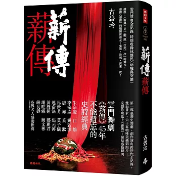 全書收錄《薪傳》創作靈感、編舞歷程、道具與音樂創作軌跡,也記錄舞者們淚水與汗水交織的不服輸精神,此外更邀請各界知名人士,分享他們與《薪傳》的相遇及感動。搭配六十五幀精美攝影照片,完整收藏紙上《薪傳》。