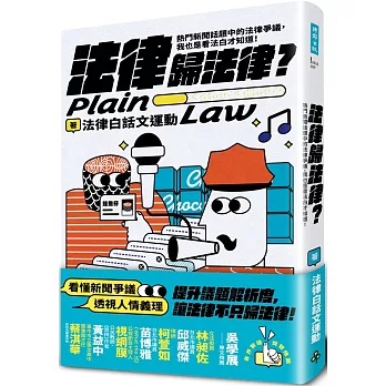 法律白話文運動由專業視角切入,解析一般人看新聞時搞不清楚、想都沒想過,甚至滿頭問號的法理爭議,將拗口的法條轉譯成淺顯易懂的白話文,讓人人都能得到一把識讀媒體與法律邏輯的鑰匙。