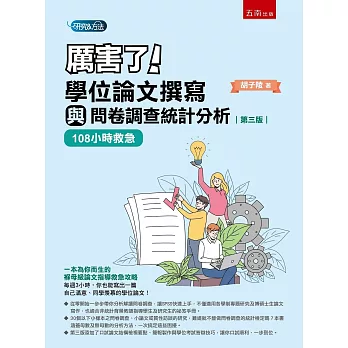 作者融會多年來指導數十位研究生論文的經驗,從論文的完整流程、基本架構,到問卷調查的信效度分析,一步一腳印帶著初學者領略統計分析與論文的撰寫技巧。108小時後——學位論文輕鬆到手!