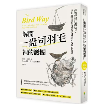 從令人眼花繚亂的羽毛故事,到幾乎深不可測的模仿軼事,珍妮佛·艾克曼的《解開一盎司羽毛裡的謎團》是對鳥類世界神祕的漫遊。艾克曼對鳥的熱愛在她的寫作中顯而易見。她高超的敘事方式描繪了豐富的畫面,吸引了讀者的想像力,使難以掌握的研究變得容易理解。──《科學雜誌》(Science Magazine)