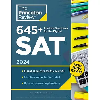 PRACTICE MAKES PERFECT! This all-new collection--designed specifically for the NEW digital SAT--provides students with hundreds of opportunities to hone their SAT test-taking skills and work their way toward an excellent score.THE SAT IS CHANGING! Starting March 2024, a new version of the SAT will debut. Created specifically for this new test, The Princeton Review’s 645+ Practice Questions for the Digital SAT provides all the practice students need to ace this important exam. It includes: an overview of SAT basics, scoring, and contentstrategies and fundamental instruction for the test’s 3 sectionsover 500 in-book practice questions arranged into 3 full practice tests, including modules that mimic the new section adaptability, plus a bonus module of higher-difficulty questionsplus an additional full-length online practice test in The Princeton Review’s new Digital SAT Exam interface, which directly replicates the College Board’s test interface for a realistic testing experience