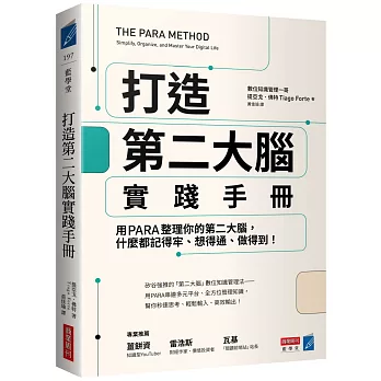 提亞戈透過《打造第二大腦 實踐手冊》更進一步解析建構第二大腦的PARA系統,從每個人的現實需求出發,用最常見的實例一步步示範,幫助每個讀者(以及需要合作、共創內容的伙伴)管理好數位生活中海量繁複的資料。